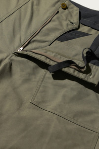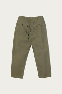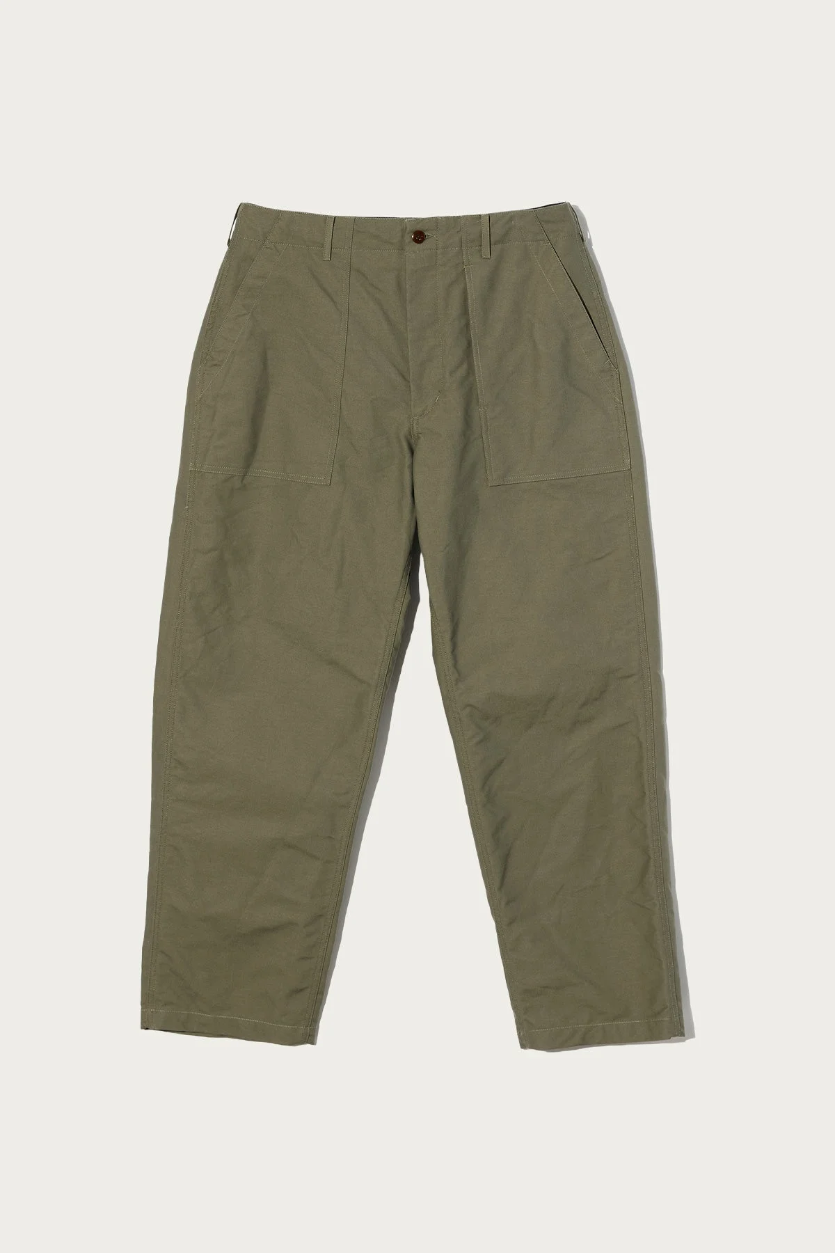 A core EG silhouette crafted from a breathable but structured double cloth. These fatigue pants feature patch front pockets, rear button-flap pockets, and adjustable drawstring for a tailored fit without tailoring. The olive tone is versatile and earthy, pairing well with denim jackets or tonal field jackets. - Midweight double cloth cotton - Patch front + flap back pockets - Adjustable drawstring - Made in USA