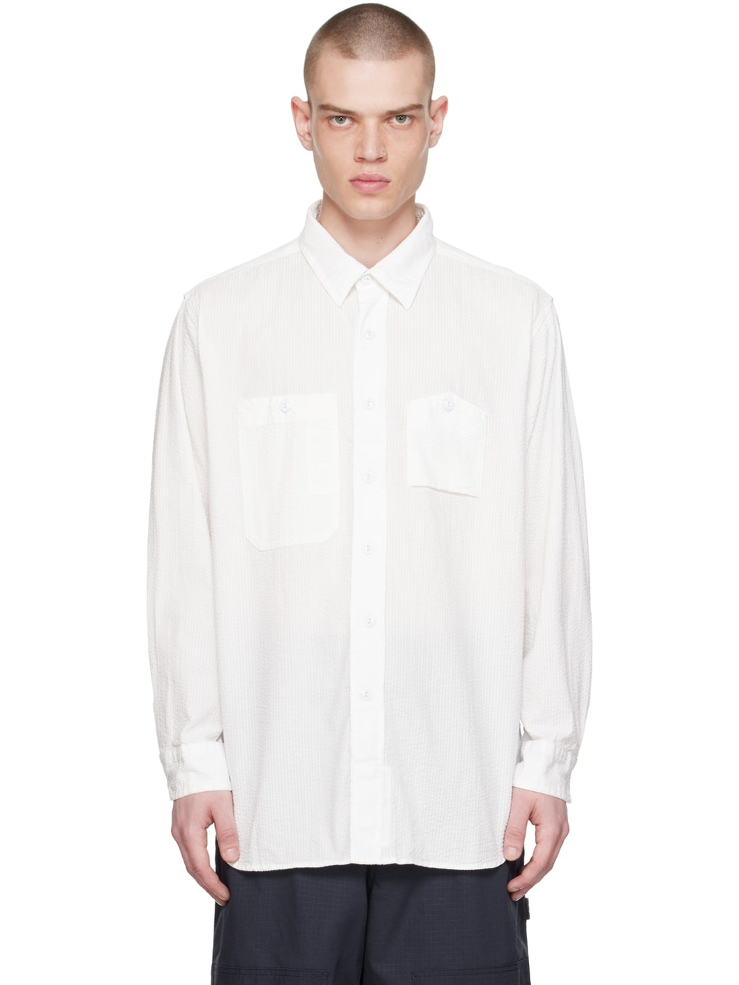 Cotton seersucker shirt. · Spread collar · Button closure · Patch pocket · Droptail hem · Single-button barrel cuffs Supplier color: White tone
