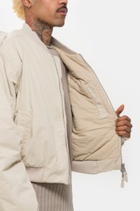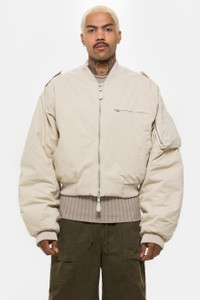 Entire Studios unisex boxy fit cropped bomber jacket in off white. Features a cotton canvas shell, quilted lining, and enzyme wash. Fit - Unisex regular fit Feature - Boxy fit - Cotton canvas outer shell - Enzyme wash - Quilted lining - YKK two-way zippers Fabrication - 100% cotton - Made in China SKU: ES2452BA-XXS