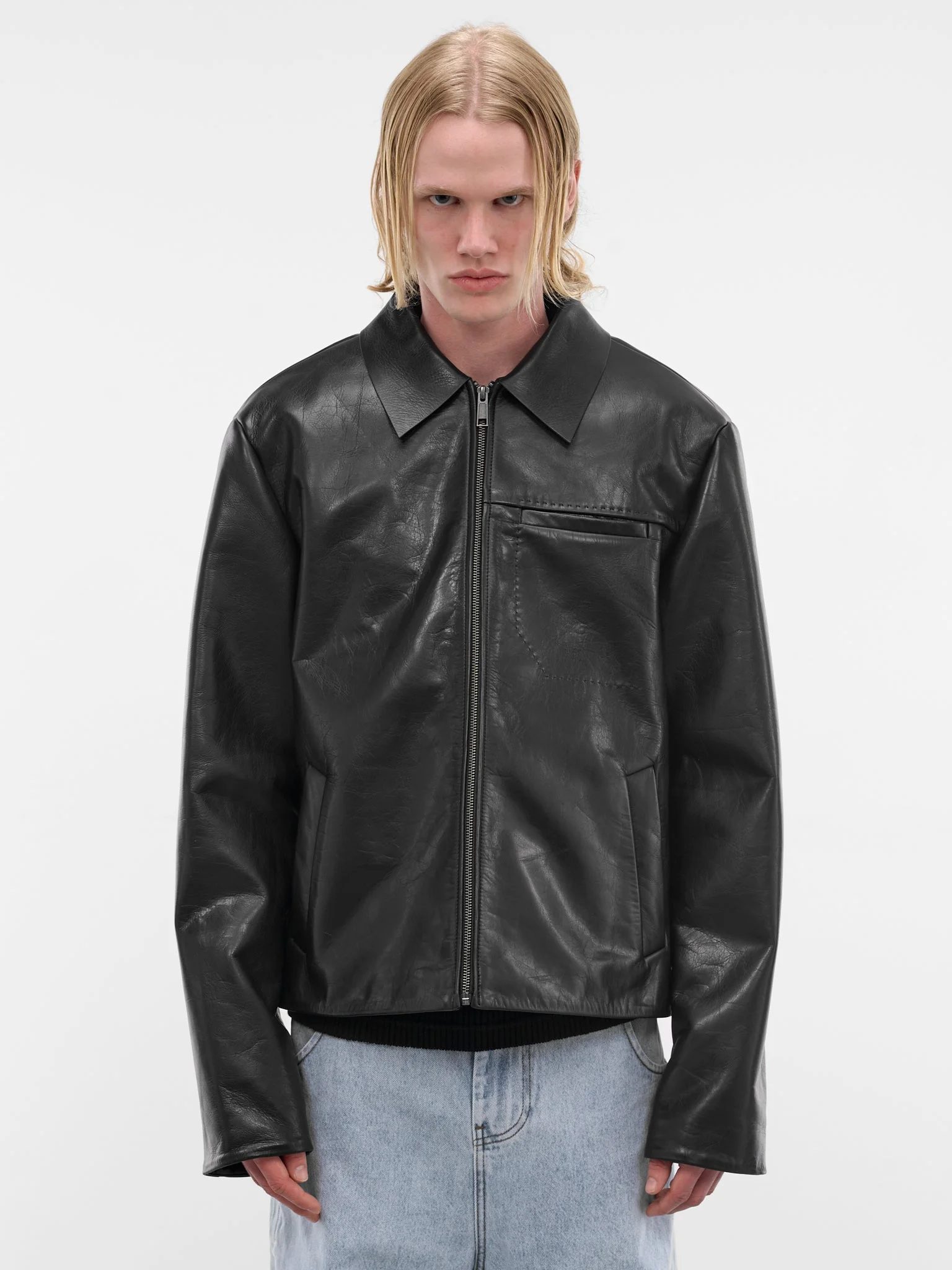 Jacket in black constructed from leather with a zip-front closure and vented back. Featuring: • Regular fit • Leather construction • Spread collar • Front zip closure • Long sleeves • Chest pocket • Side welt pockets • Vent at back • Made in China • 100% Leather • Standard sizing Model is 6'0" wearing size M. Shoulders: 19" Chest: 35" Waist: 28"