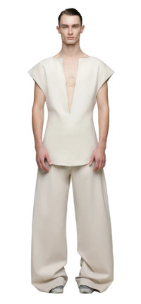 - WOOL SUITING BLEND - BACK SHAPING DARTS - SLEEVELESS TANK - RAW DEATILING - SHOULDER SEAM FORWARD - FULLY LINED