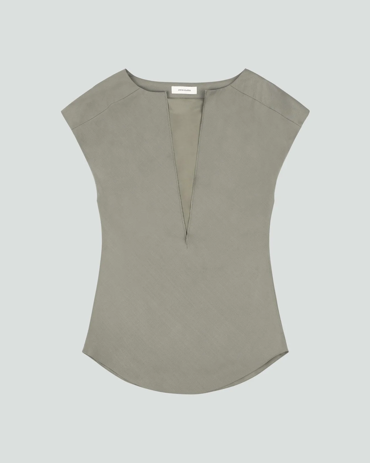 - 100% WOOL SUITING - BACK SHAPING DARTS - SLEEVELESS TANK - RAW DEATILING - SHOULDER SEAM FORWARD - FULLY LINED