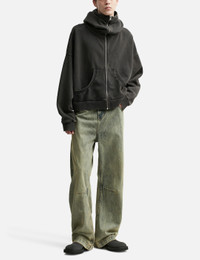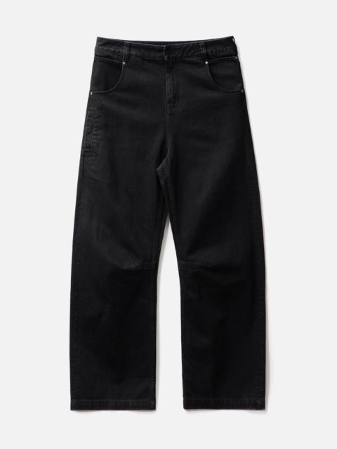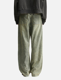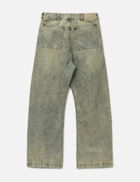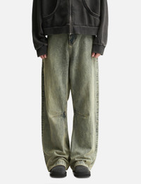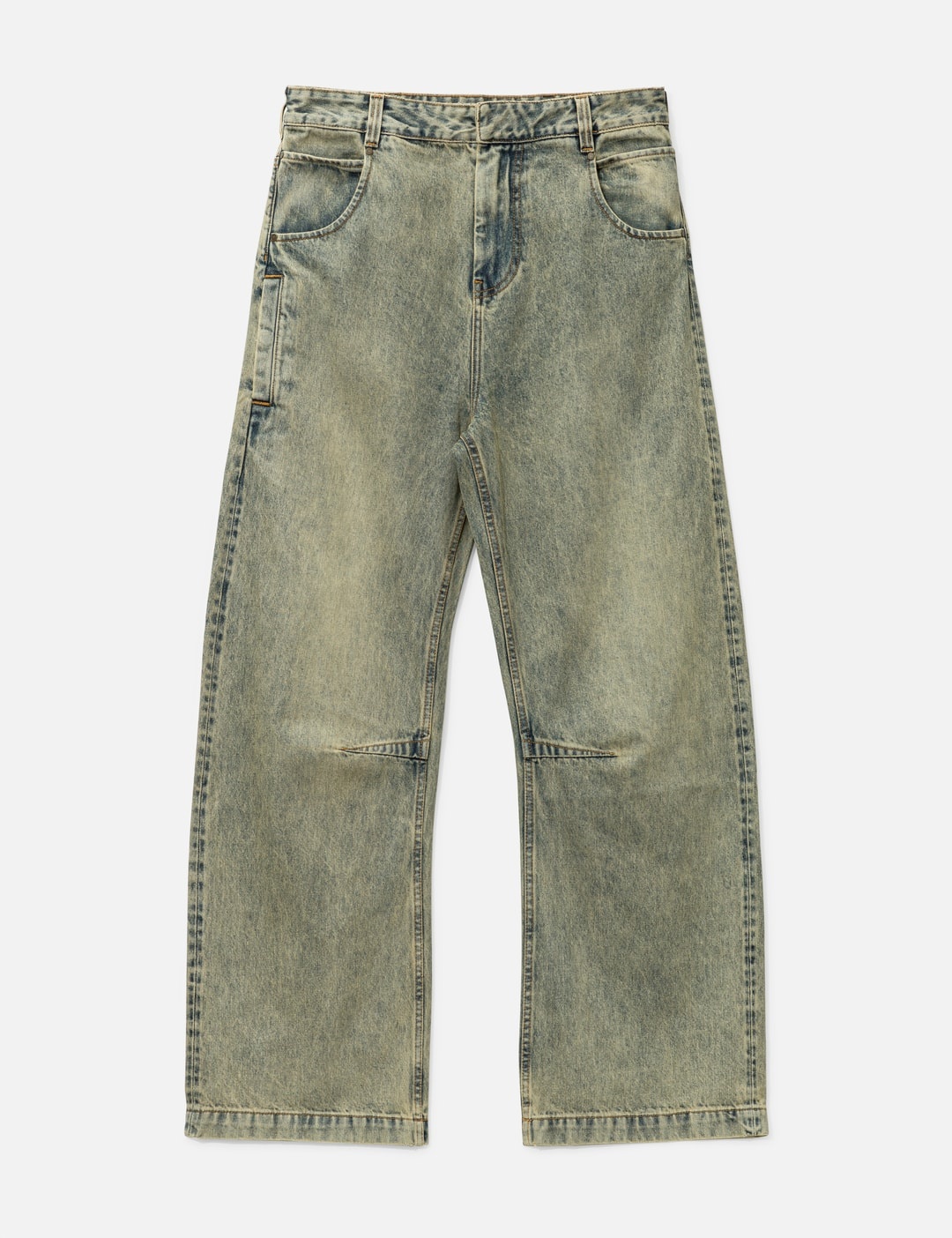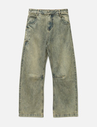 - Entire Studios - Gem Jeans - Made with 13.75 oz Japanese selvage denim - Faded treatment - Two side pockets; two back pockets - YKK zip fly with concealed button closure - Inner leg dart - Wide leg - Unisex fit - Color: Surface Wave - Material: 100% Cotton - See more Jeans and Clothing SIZING - Model wears size M - Model measures: Height 189cm, Chest 31.5"/80cm, Waist 27”/69cm, Hip 34.3’’/87cm