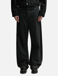 - Entire Studios - Dem Jeans - Made with 13.75 oz Japanese selvage denim - Two side pockets - Two back pockets - YKK zip fly with concealed button closure - Inner leg dart - Wide leg - Unisex fit - Color: Magnetite - Material: 100% Cotton - See more Pants and Clothing SIZING - Model wears size M - Model measures: Height 187cm, Chest 36”/91cm, Waist 28”/72cm, Hip 36”/91cm
