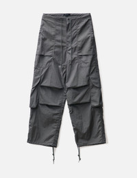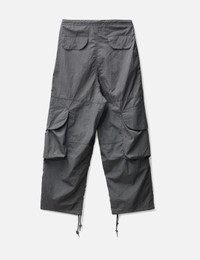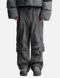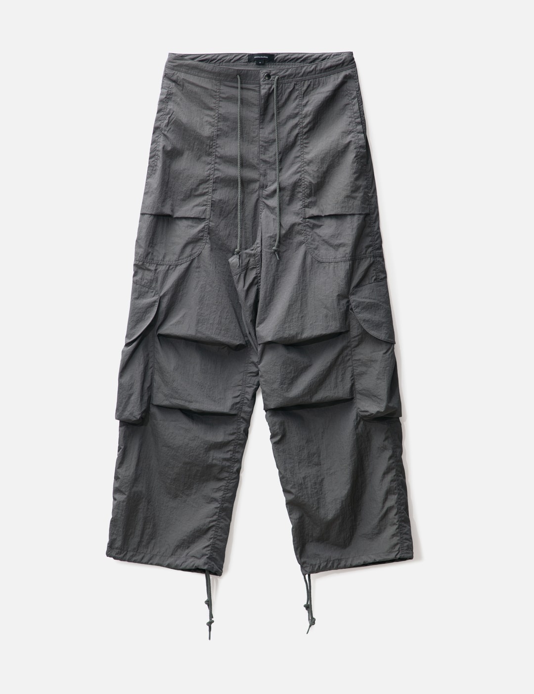 - Entire Studios - Freight Cargo - Slightly oversized fit - Zip fly with metal shank button - Wide leg - Drawstring waist and bottom hem - Waist pockets - Two cargo pockets with metal snap closure - Color: Rock - Material: 100% Nylon - See more Pants and Clothing SIZING Male - Model wears size M - Model measures: Height 187cm, Chest 36”/91cm, Waist 28”/72cm, Hip 36”/91cm - Model wears size S - Model measures: Height 179cm, Chest 32”/81cm, Waist 23’’/58.42cm, Hip 35’’/88.9cm