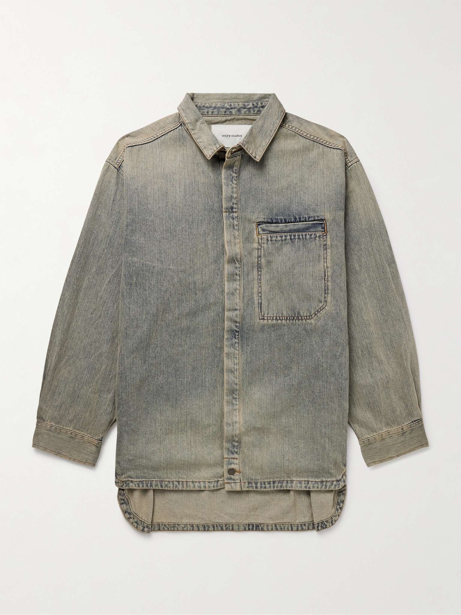 Entire Studios’ ‘Herculean’ shirt is made from Japanese selvedge denim that’s heavily faded to resemble a well-worn style. Cut for an oversized fit, it has a single chest pocket and elongated, curved back hem. Size & Fit - Fits true to size. Take your normal size - Take the next size down if you wish to achieve a closer fit - Oversized fit, designed to be worn loose - Particularly long in the sleeves - Mid-weight, non-stretchy fabric - Model is shown wearing a M - Model measures: chest 38"/ 96cm, height 6'1"/ 185cm Details & Care - Light-blue and beige denim - Button fastenings - 100% cotton - Machine wash - Designer wash: Surface Wave