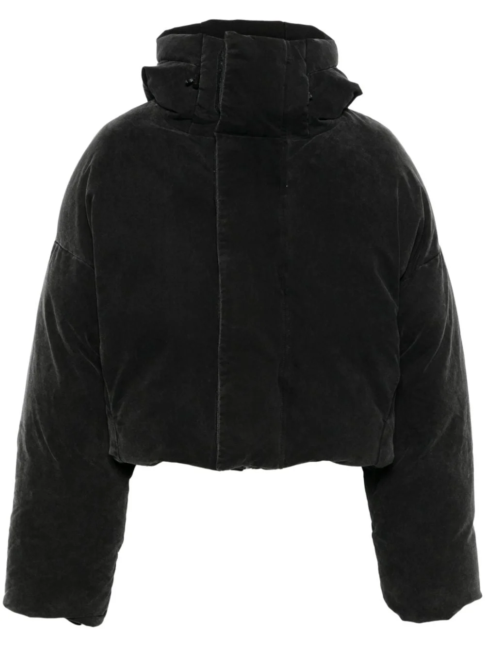 hooded puffer jacket Highlights - Black - Cotton - Twill weave - Faded effect - Padded design - Duck down-feather filling - Drawstring hood - Concealed front zip fastening - Front touch-strap fastening - Funnel neck - Drop shoulder - Extra-long sleeves with ribbed cuffs - Internal zip-fastening pocket - Full lining - Straight hem - When buying this unisex item, keep in mind that it is graded in standard men's sizing. Imported Composition Lining: Cotton 100%, Duck Down 90%, Duck Feathers 10% Outer: Cotton 100% SIZE & FIT Model measurements Height 5 ft 10 in(1.78 m) Bust/Chest 31.49 in(80 cm) Hips 37 in(94 cm) Waist 23.62 in(60 cm) Measurement SLEEVE LENGTH 22.44 in(57 cm) LENGTH 22.83 in(58 cm) WAIST 55.11 in(140 cm) BUST 55.9 in(142 cm) Shoulder Width 31.1 in(79 cm) FittingInformation This piece is unisex – if you usually select men's sizing expect a loose fit throughout; if you usually select women's sizes, expect an oversized fit Made from a padded non-stretch fabric, giving it no natural elasticity Washing instructions Hand Wash