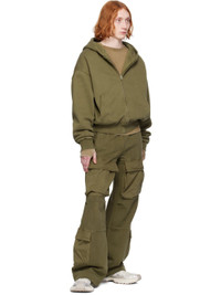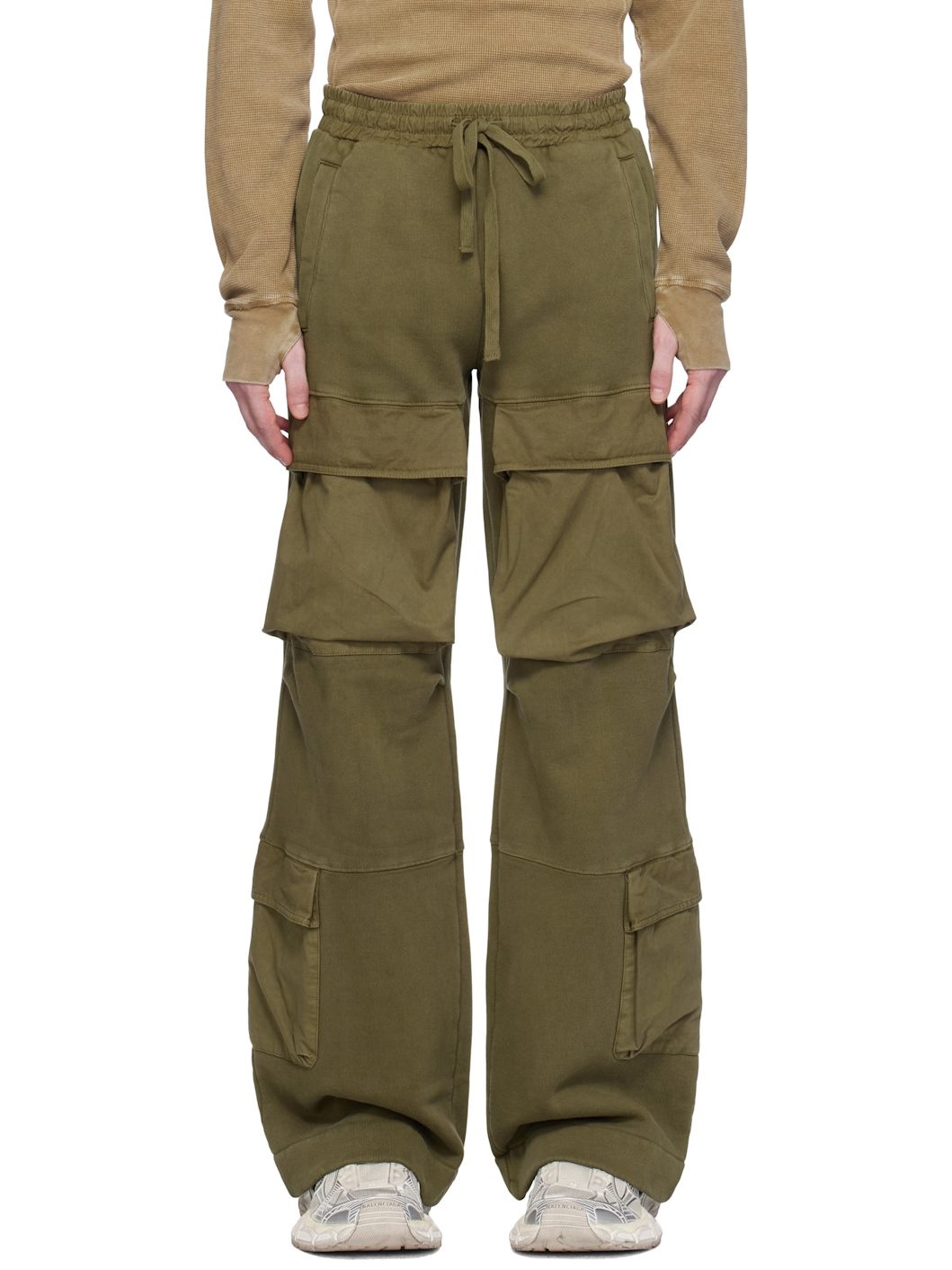 Baggy-fit 510 gsm organic cotton fleece and twill cargo pants. Fading throughout. · Enzyme-washed and brushed · Paneled construction · Drawstring at elasticized waistband · Four-pocket styling · Cargo pocket at legs and outseams Part of the Uniform collection. Supplier color: Military