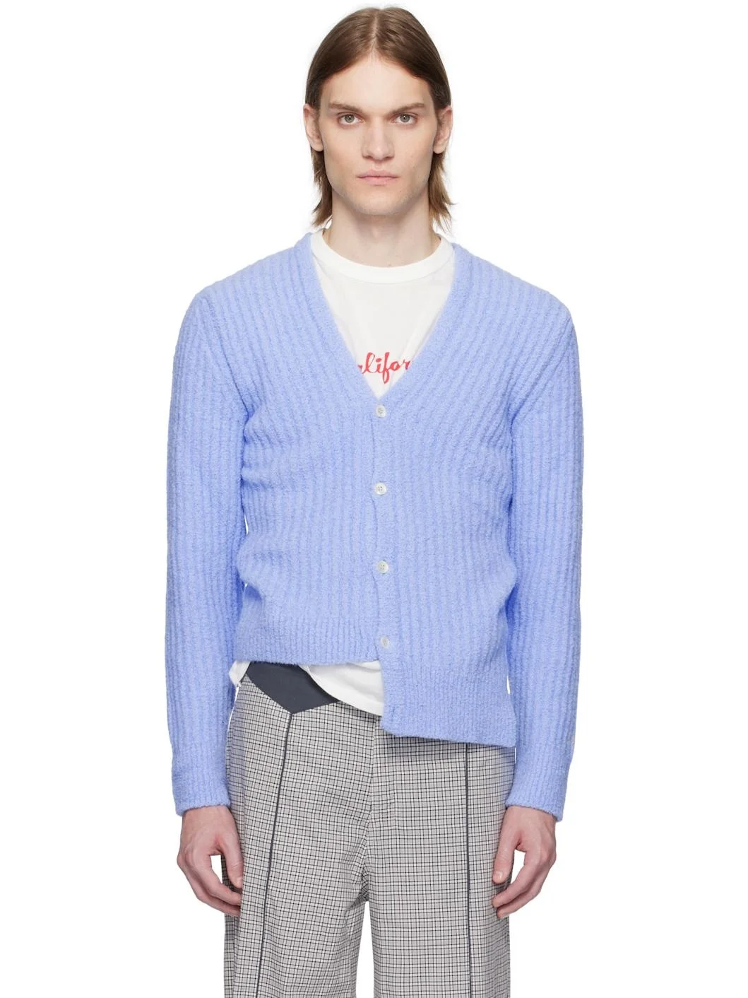 Rib-knit nylon cardigan. · Y-neck · Button closure · Asymmetrical hem · Dropped shoulders · Logo embroidered at cuff Supplier color: Light blue 100% polyamide. Made in Italy 251260M200004