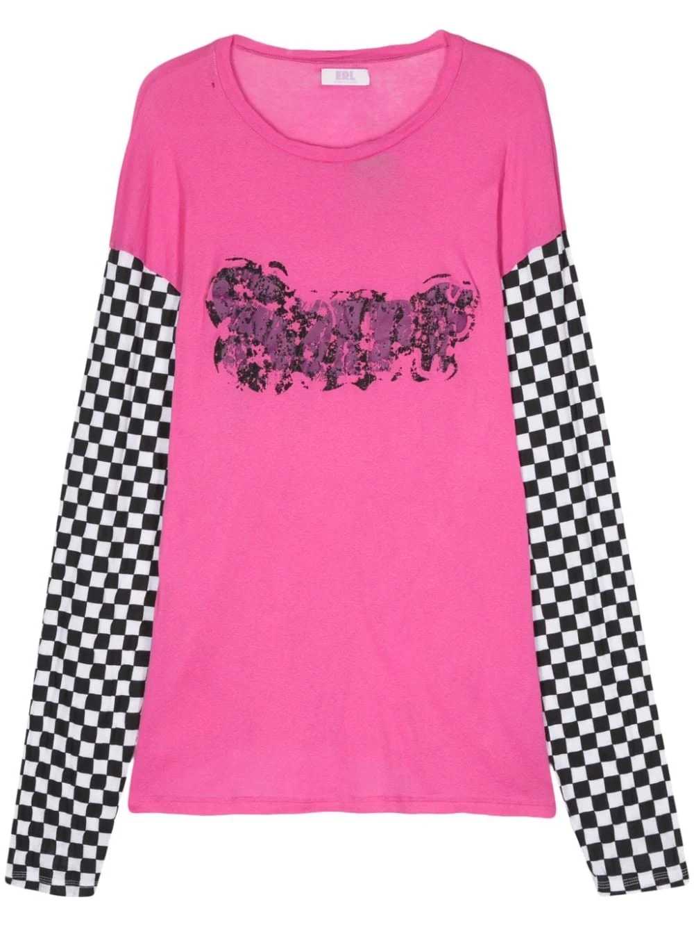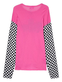 distressed-finish cotton T-shirt Highlights - Fuchsia pink/multicolour - Cotton - Jersey texture - Distressed finish - Colour-block panelled design - Check-pattern sleeves - Motif print to the front - Round neck - Long sleeves - Straight hem Imported Composition Cotton 100%
