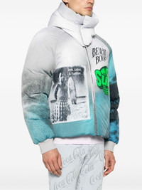 graphic-print hooded puffer jacket Highlights - Blue/multicolour - Padded design - All-over graphic and text print - Detachable hood - Front zip fastening - Long raglan sleeves - Two side slit pockets - Straight hem - Full lining - When buying this unisex item, keep in mind that it is graded in standard men's sizing. Imported Composition Lining: synthetic fibres 100% Outer: Nylon 100% SIZE & FIT Model measurements Height 5 ft 10 in(1.78 m) Bust/Chest 33.07 in(84 cm) Hips 36.61 in(93 cm) Waist 24.8 in(63 cm) FittingInformation This unisex piece is designed for a loose fit whether you usually select women's or men's sizes Made from a padded non-stretch fabric, giving it no natural elasticity