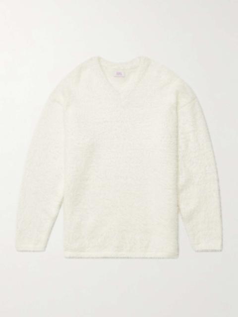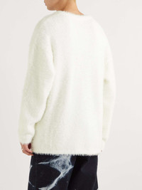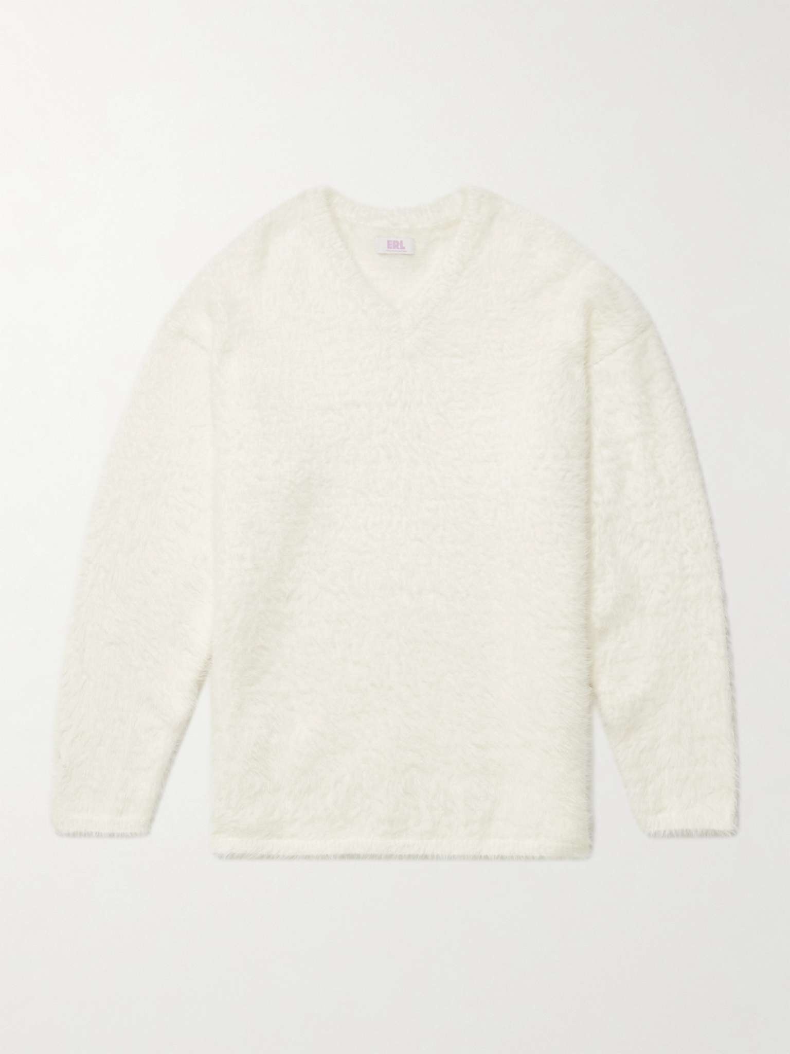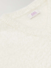 Informed by the laid-back attitude of Venice Beach, ERL's sweater is cut for a slouchy, loose fit. It has a soft, fuzzy handle that's brushed for extra softness and fitted with ribbed trims. It's finished with the label's signature logo embroidery at the cuff. Size & Fit - Fits true to size. Take your normal size - The model is wearing a size larger to achieve the runway look - This sweater is intended for a regular cut - Mid-weight, slightly stretchy fabric - Model wears a M - Model measures: chest 36"/ 92cm, height 6'0"/ 183cm Details & Care - White recycled polyamide-blend - 65% recycled polyamide, 35% polyamide - Hand wash or dry clean - This item has been imported