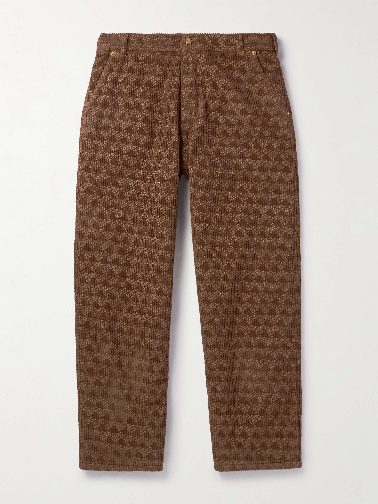 ERL's Italian-made trousers are crafted from cotton-corduroy that's embossed in a repeating logo motif. Cut for a straight-leg fit, they're lightly padded for a fuller silhouette. Wear yours with a T-shirt and thematching jacket. Size & Fit - Fits true to size. Take your normal size - Regular-straight leg, low-crotch style - Slightly short in length - Lightly padded, non-stretchy fabric - Model is shown wearing a S - Model measures: waist size 30, height 6'2"/ 188cm Details & Care - Brown cotton-corduroy - Button and zip fastening - 100% cotton; padding: 100% polyester - Machine wash - This item has been imported