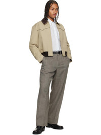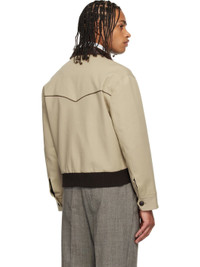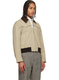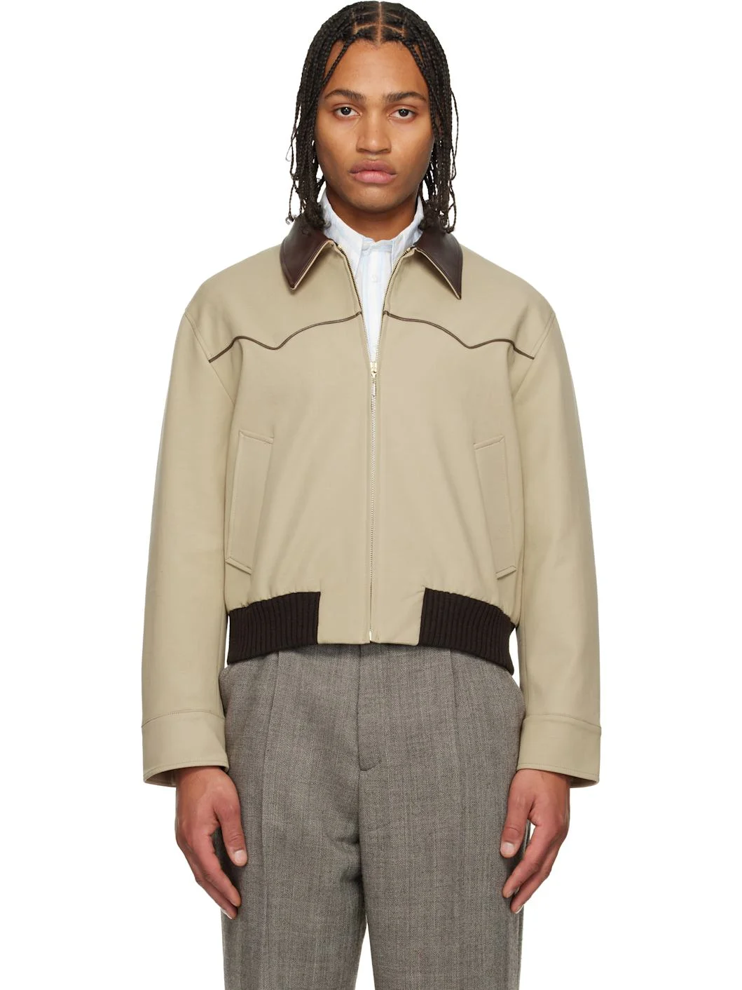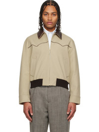 Stretch cotton twill jacket. · Buffed lambskin spread collar · Zip closure · Lambskin piping at front and back yoke · Welt pockets at front · Rib-knit hem · Buttoned barrel cuffs · Welt pocket at interior · Full satin lining Supplier color: Beige Body: 98% cotton, 2% elastane. Trim: 100% lambskin. Lining: 52% viscose, 48% cupro. Made in Portugal 252600M180017