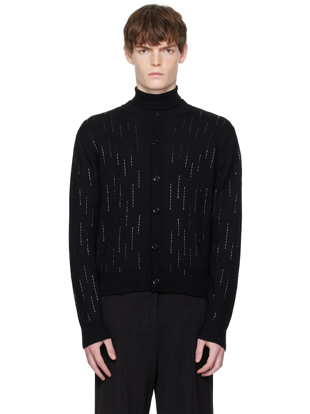 Knit virgin wool cardigan. · Crystal appliques throughout · Rib-knit crewneck, hem, and cuffs · Button closure Supplier color: Black Crystal 100% virgin wool. Made in Portugal 252600M200004