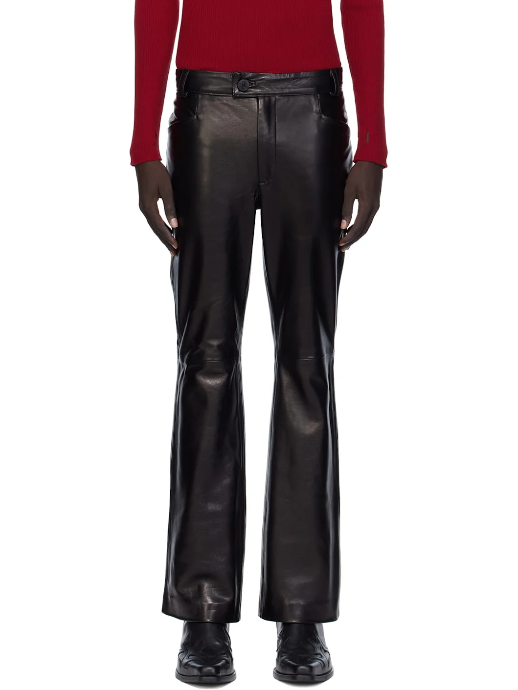 Grained leather pants. · Flared · Belt loops · Four-pocket styling · Zip fly · Partial satin lining Supplier color: Black leather Body: 100% leather. Lining: 52% viscose, 48% cupro. Made in Portugal 252600M189003