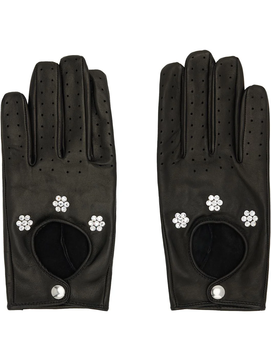 Grained lambskin gloves. · Perforations at fingers · Cutout with floral Swarovski crystal accents at top · Press-stud fastening at cuffs · Suede interior Supplier color: Black w/ Swarovski crystals Lambskin. Made in Portugal 252600M135008