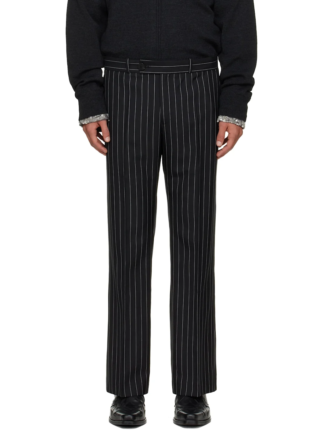 Virgin wool-blend twill trousers. · Pinstripes throughout · Flared · Belt loops · Four-pocket styling · Zip fly · Creased legs Supplier color: Black white pin stripe Body: 55% polyester, 45% virgin wool. Trim: 100% cotton. Made in Portugal 252600M191007