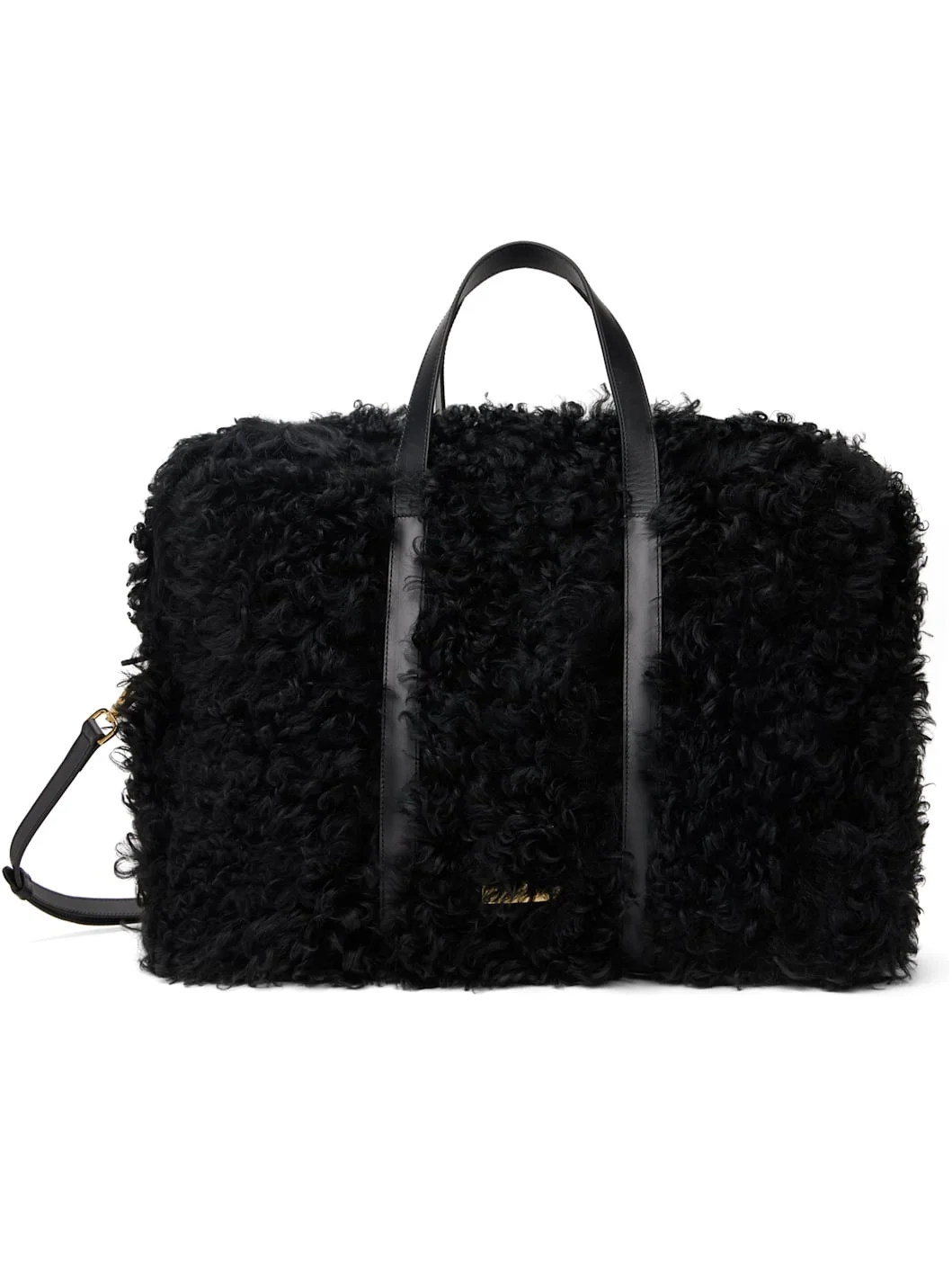 Shearling duffle bag in black. · Buffed leather trim throughout · Twin carry handles · Adjustable and detachable shoulder strap · Logo plaque at face · Bumper studs at base · Zip closure · Zip pocket at interior · Twill lining · Gold-tone hardware · H16" x W20" x D6" Supplier color: Black