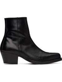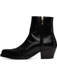 Ankle-high polished calfskin boots. · Pointed toe · Studded detailing at vamp · Zip closure at inner side · Grained calfskin lining · Stacked leather block heel with rubber injection · Calfskin sole · Heel: H2.25" Supplier color: Black Calfskin. Made in Portugal 252600M228000