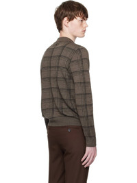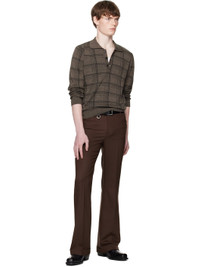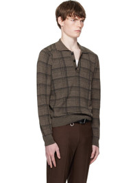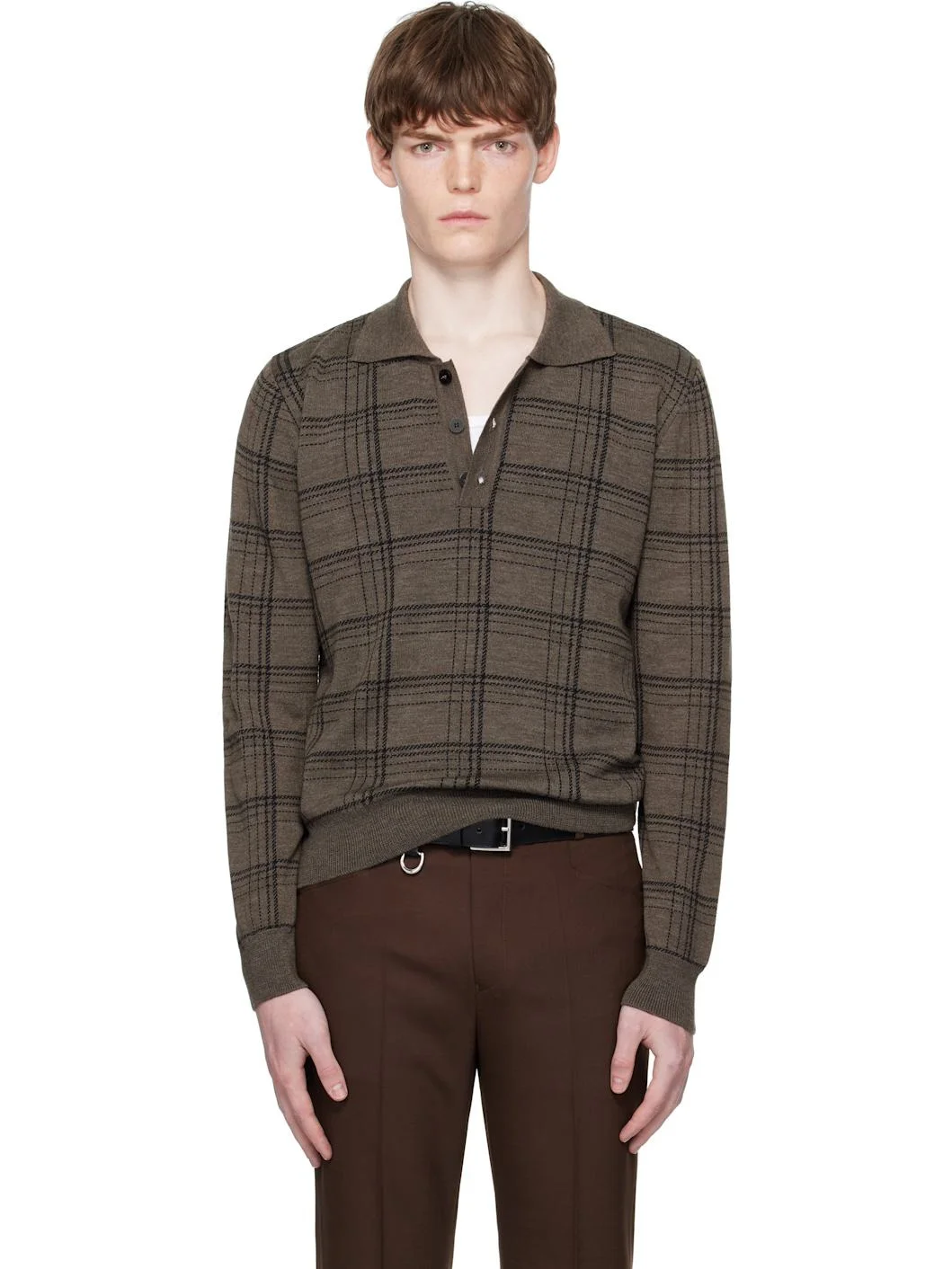 Knit extrafine merino wool-blend polo. · Jacquard check pattern throughout · Rib-knit spread collar, hem, and cuffs · Three-button placket Supplier color: Brown/Black 50% extrafine merino wool, 50% acetate. Made in Portugal 252600M212003