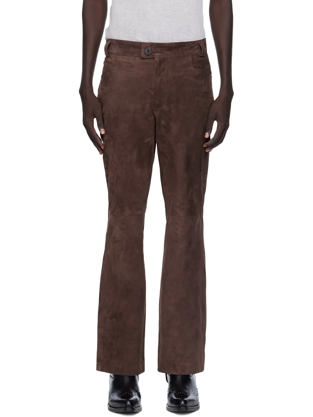 Suede trousers. · Flared · Belt loops · Four-pocket styling · Zip fly · Partial satin lining Supplier color: Brown suede Body: 100% leather. Lining: 52% viscose, 48% cupro. Made in Portugal 252600M189004