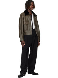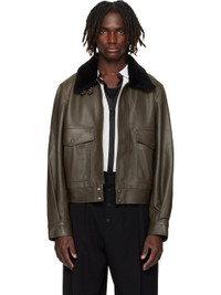 Grained lambskin jacket. · Pin-buckle straps at shearling spread collar · Concealed zip closure · Flap and welt pockets at waist · Elasticized hem · Grommets at armscyes · Press-stud barrel cuffs · Welt pocket at interior · Full satin lining · Silver-tone hardware Supplier color: Olive Body: 100% lambskin. Lining: 52% viscose, 48% cupro. Made in Portugal 252600M181003