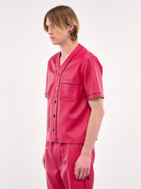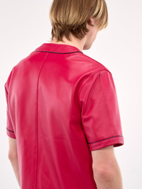 ERNEST W. BAKER shirt in red, paneled lamb leather construction, v-neckline, contrast piping, front button placket closure, short sleeves, chest patch pocket, straight hem, relaxed fit. Made in Portugal 100% Lamb Leather Standard Sizing Model is 6'1.5" wearing size M. Shoulders: 18.5" Chest: 37" Waist: 31"