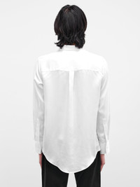 White cotton shirt with pointed collar and back yoke pleating. Featuring: • Slim fit • Pointed collar • Front button placket closure • Long sleeves with buttoned cuffs • Back yoke pleating • Chest patch pocket and shirttail hem • Made in Portugal • 96% Cotton 4% Elastane • Standard/Italian sizing Model is 5'11" wearing size M(48). Shoulders: 18" Chest: 36" Waist: 27"