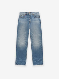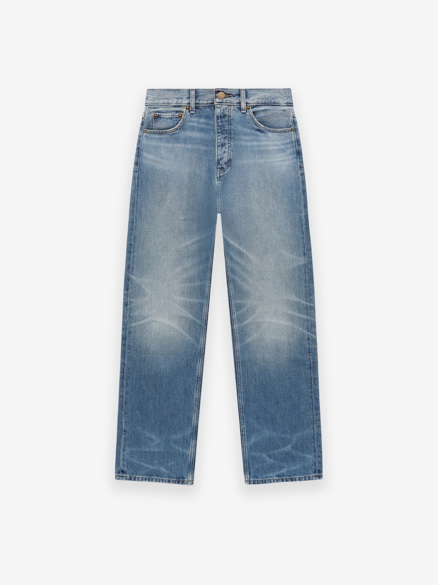 The 5 pocket jean is made in 100% cotton denim in a medium wash and designed in a timeless straight leg fit. Antique brass hardware provides a natural vintage appearance. An Essentials rubberized label is stitched on the pocket. DETAILS - 100% Cotton Denim - Straight Leg Fit - 5 Pocket - Front Zip - Antique Brass Hardware - Fear of God rubberized label at back collar - Imported
