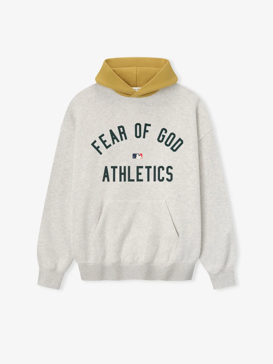 The Athletics Sport Hoodie is crafted from core fleece, offering an elevated balance of softness, structure, and lasting comfort. Cut in a relaxed sport fit, it drapes with more ease through the body and extended length compared to the Essentials classic silhouette. The front features a bold puff-print graphic reading "Fear of God Athletics" alongside the official MLB insignia, while the back is finished with the authentic Athletics logo. Additional features include a contrasting hood, kangaroo pocket, rib-knit at the cuffs and waist hem. The signature rubberized Fear of God Essentials label accents the hood. DETAILS - 80% COTTON / 20%POLYESTER FLEECE - ESSENTIALS SPORT FIT: RELAXED, CROPPED - FEAR OF GOD ATHLETICS LOGO - ATHLETICS SCRIPT LOGO - FEAR OF GOD LABEL - KANGAROO POCKET - ELASTIC BINDING AT CUFF AND WAIST HEM - IMPORTED