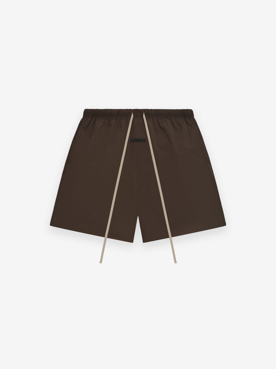 The Bonded Nylon Soccer Short is made in double-layered stretch nylon for polished structure, and a full perforated poly lining for comfort. The relaxed leg fit pant has an encased elastic waistband, elongated drawstring, and side pockets.. Minimalist branding is seen in the Essentials Fear of God black bar at center front. DETAILS - Bonded 90% nylon, 10% spandex - 100% polyester perforated lining - Relaxed leg fit - Encased elastic waistband - Heavyweight drawstring with rubberized tip - Side pockets - Essentials Fear of God rubberized label - Imported