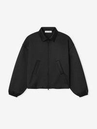 The Bonded Satin Bomber Jacket is made from a shiny, stretch fabric, providing a sleek aesthetic with a full perforated lining for breathability. It features a rounded, cropped bomber style with a mockneck, full front zip, slash pockets, elastic cuffs, and waist hem. A Fear of God Essentials rubberized label is stitched at the back collar. DETAILS - 94% polyester, 6% spandex - MODEL IS 6'2" AND WEARS SIZE MEDIUM IN JET BLACK - Short, boxy fit - Mockneck - Full front zip - Slash Pockets - "Fear of God Essentials" rubberized label - Imported