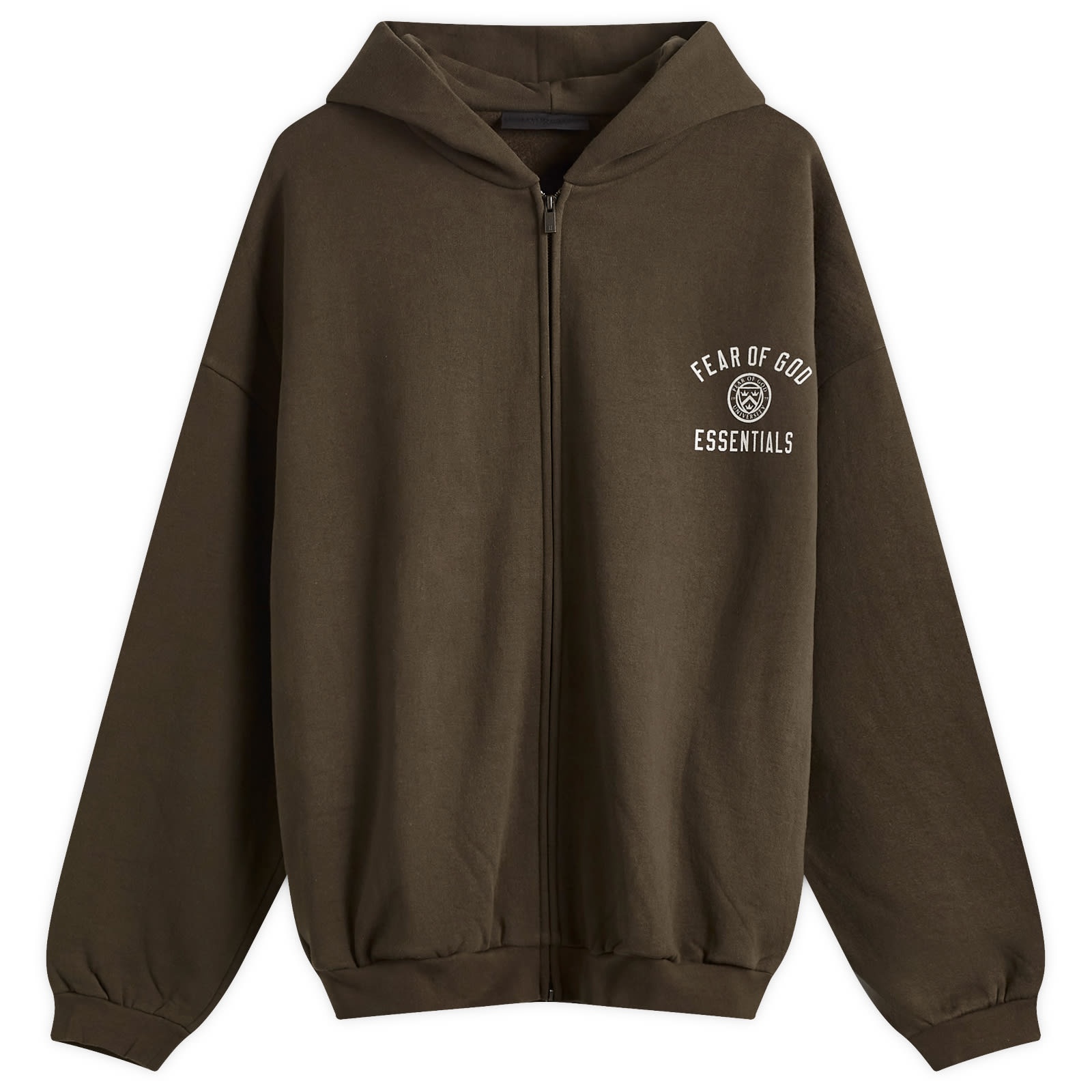 Bringing quality and comfort to modern, luxury streetwear, Fear of God Essentials is your go-to for stylish loungewear. The fleece full zip hoodie is exquisitely crafted from heavyweight cotton with a subtle vintage wash. Adorned with a collegiate-inspired, satin twill logo detail stitched across the back along with a university crest graphic on the chest, it features a double-layered hood, refined rib-knit trims and side pockets. Signed off with a signature rubber logo on the hood, it’ll add an effortlessly elevated, warm layer to any look. - 100% Cotton - Relaxed Fit - Front Zip Closure - Vintage Wash - Ribbed Trims - Double-Layer Hood - Side Pockets - Printed Branding & Patch