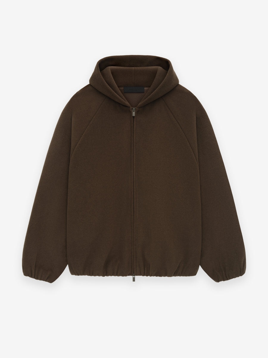 The Brushed Hooded Bomber is constructed in a heavyweight, soft brushed yarn to provide warmth, comfort, and structure. The fit is relaxed in the body and sleeves The collegiate Fear of God Essentials logo is applied in satin twill lettering. Functional details include a front half zipper, side seam pockets, and elastic binding on the sleeve, and waist hem. DETAILS - 88% poly / 12% viscose - Relaxed fit - Fear of God Essentials satin twill lettering - Full zip front - Sleeve and Waist Hem with elastic binding - Side seam pockets - Imported