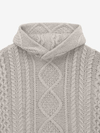 The Essentials hoodie is elevated in a cable knit to provide appealing softness, body, and texture. A double-layered hood and knitted cuffs frame the piece. A Fear of God rubberized label is on the center of the hood. Model is 6'3 and wears size Medium.