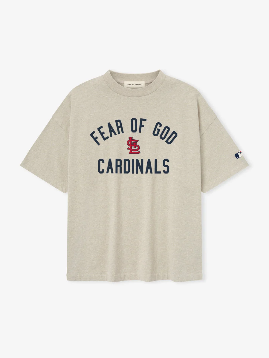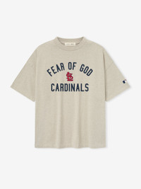 The Cardinals 90s Tee is cut from 100% cotton jersey, offering a soft yet substantial hand feel. Designed in an oversized 90s-inspired silhouette, it features exaggerated proportions with dropped shoulders for a relaxed drape. The front is defined by a bold puffer-print application of the "Fear of God Cardinals" lockup, alongside the MLB insignia on the sleeve. Across the back, an official St. Louis logo anchors the piece with the signature rubberized Fear of God Essentials label at the collar. Size Note: size down for a classic fit DETAILS - 100% COTTON JERSEY, 220GSM - ESSENTIALS 90s FIT - OVERSIZED BODY AND SLEEVES - FEAR OF GOD CARDINALS GRAPHIC - MLB LOGO - ST. LOUIS LOGO - CLASSIC RIB-KNIT COLLAR - FEAR OF GOD ESSENTIALS RUBBERIZED LABEL AT BACK COLLAR - IMPORTED