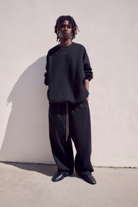 The Essentials crewneck is made in core fleece and designed with volume to create a round, cropped silhouette. New minimalist branding is seen in the rubberized Essentials Fear of God black bar on the center front. Details include side seam pockets, a new crew neckline with stretch binding at the collar, rib-knit cuffs, and a waist hem. A Fear of God rubberized label is at the back collar. DETAILS - 80% cotton / 20% polyester heavyweight fleece - Essentials fit - relaxed body, sleeves - Rib-knit cuff and tapered waistband - Crew neckline with stretch binding - Side seam pockets - Essentials Fear of God black bar on the center front - Fear of God rubberized label at back collar - Imported