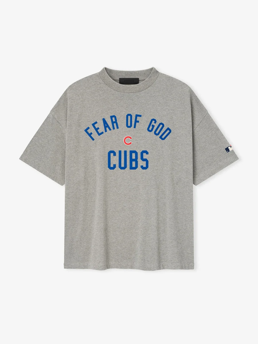 The Cubs 90s Tee is cut from 100% cotton jersey, offering a soft yet substantial hand feel. Designed in an oversized 90s-inspired silhouette, it features exaggerated proportions with dropped shoulders for a relaxed drape. The front is defined by a bold puffer-print application of the "Fear of God Cubs" lockup, alongside the MLB insignia on the sleeve. Across the back, an official Chicago logo anchors the piece with the signature rubberized Fear of God Essentials label at the collar. Size Note: size down for a classic fit DETAILS - 100% COTTON JERSEY, 220GSM - ESSENTIALS 90s FIT - OVERSIZED BODY AND SLEEVES - FEAR OF GOD CUBS GRAPHIC - MLB LOGO - CHICAGO LOGO - CLASSIC RIB-KNIT COLLAR - FEAR OF GOD ESSENTIALS RUBBERIZED LABEL AT BACK COLLAR - IMPORTED
