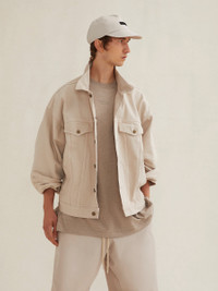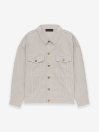 American heritage is celebrated in the Essentials denim jacket, which is given a subtle wash for a naturally faded appearance. The piece is designed with relaxed proportions and dropped shoulders. Additional details include antique brass hardware, a point collar, 3-point pocket flaps on the chest, and side seam pockets. A Fear of God rubberized label is at the back collar. Model is 6'1 and wears size Medium. DETAILS - 100% cotton denim - Fear of God rubberized label - Point collar - Side seam pockets - 3-point pocket flaps on chest - Antique brass hardware - Imported