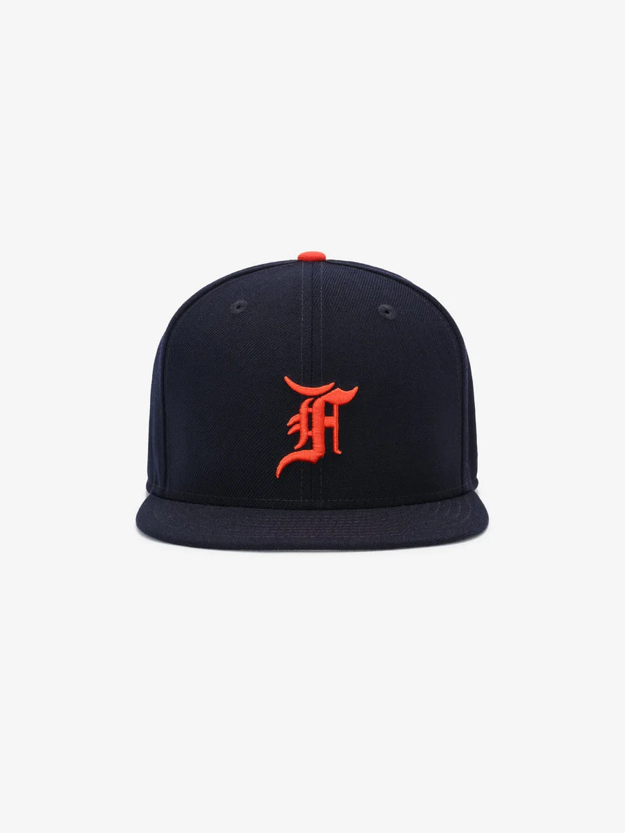 The Fear of God Essentials Detroit Tigers Fifty Fitted Cap features an embroidered Fear of God script logo at the front with a Fear of God label at the back. Additional details include a Tigers team color fabrication with a grey undervisor. DETAILS - FULLY FITTED 59FIFTY CAP - CONTRASTING GREY UNDERVISOR - EMBROIDERED F SCRIPT LOGO ON FRONT - EMBROIDERED NEW ERA SCRIPT LOGO ON SIDE - FEAR OF GOD LABEL AT BACK - 100% WOOL - IMPORTED