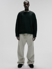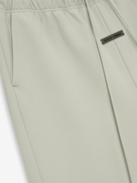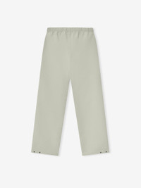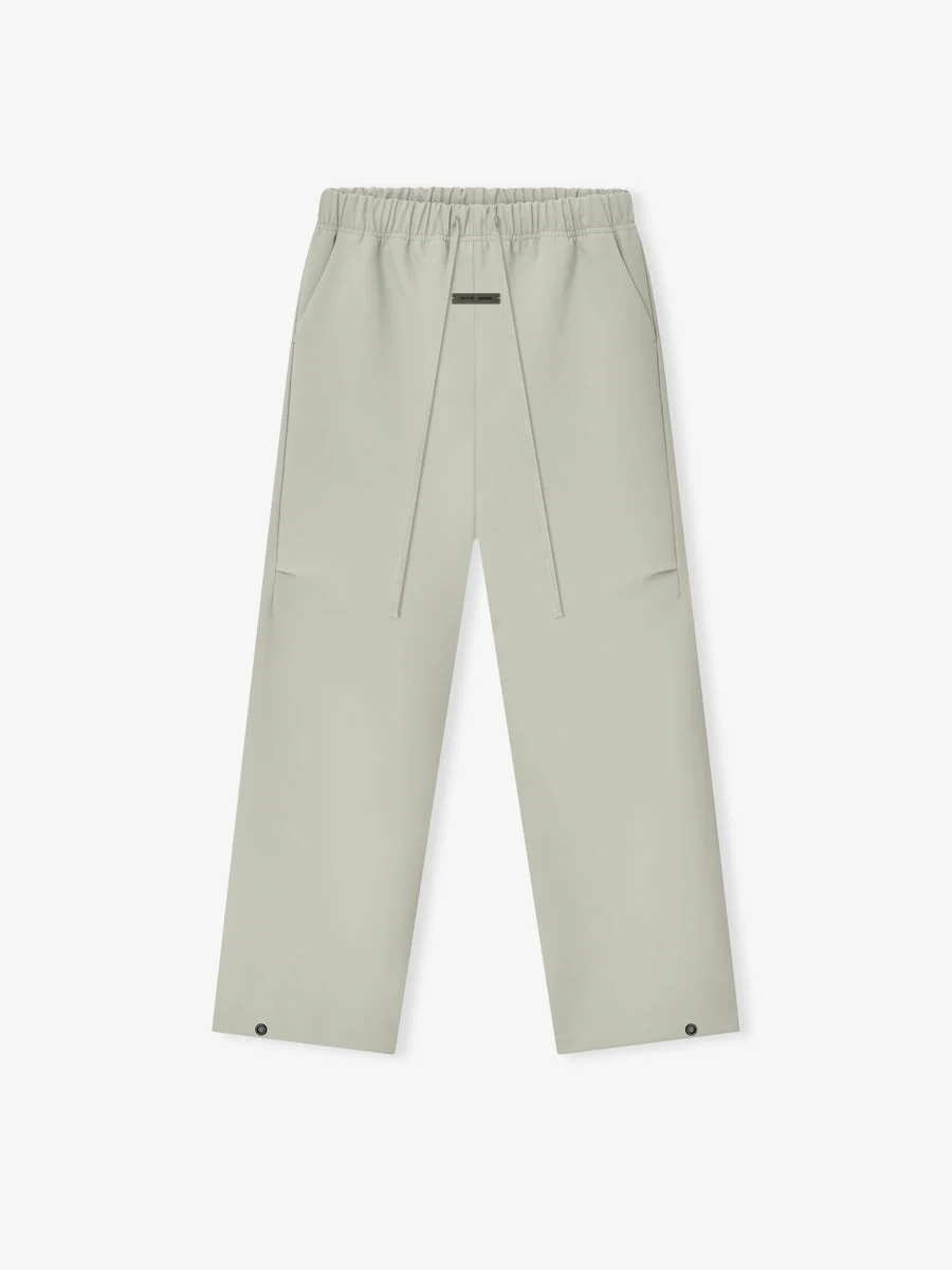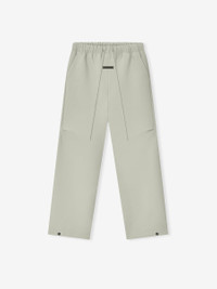 The Bonded Canvas Work Pant is made from a bonded stretch fabric that offers modern comfort while displaying a workwear-inspired style. This pant features a loose leg fit, side pockets, an encased elastic waistband with drawstrings, knee darts, and snap metal hardware at the ankle. A rubberized label from Fear of God Essentials is stitched on the center front. DETAILS - 94% polyester, 6% spandex - Loose leg fit - Knee pleat - Encased elastic waistband - Drawstring - "Fear of God Essentials" translucent rubberized label - Imported