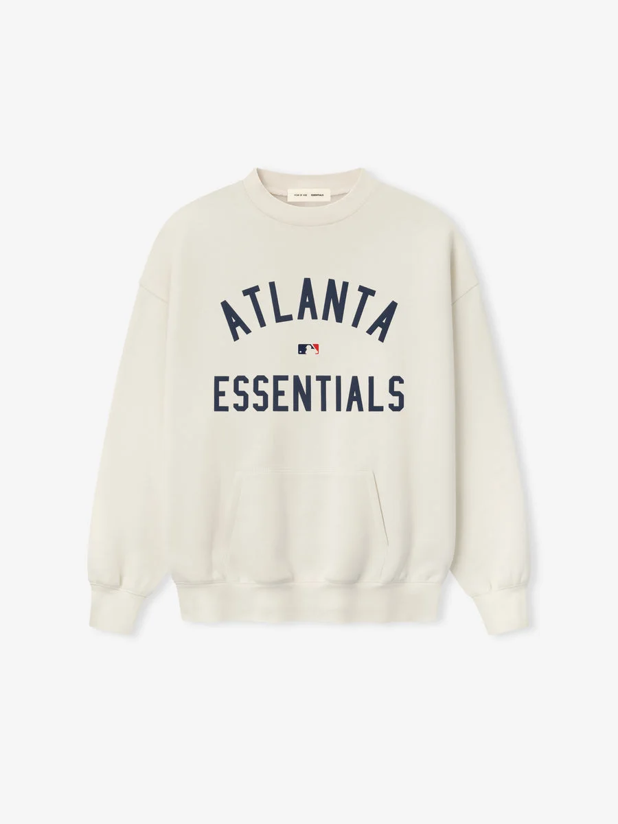 The Braves Sport Crewneck is crafted from core fleece, offering an elevated balance of softness, structure, and lasting comfort. Cut in a relaxed sport fit, it drapes with more ease through the body and extended length compared to the Essentials classic silhouette. The front showcases a puffer print with the "Atlanta Essentials" lockup, along with the iconic MLB logo. On the back, you'll find the vintage Atlanta Braves "A" logo. Additional details include side seam pockets, and rib-knit bindings at the collar, cuffs, waist hem, and a rubberized Fear of God label Essentials is attached at the back collar. DETAILS - 80% COTTON / 20% POLYESTER HEAVYWEIGHT FLEECE - ESSENTIALS MODERN FIT - CROPPED, VOLUMINOUS BODY, SLEEVES - PUFFER PRINT ATLANTA ESSENTIALS GRAPHIC AND MLB LOGO - ATLANTA "A" LOGO - ESSENTIALS FEAR OF GOD RUBBERIZED LABEL - ELASTIC BINDING AT COLLAR, CUFF AND TAPERED WAISTBAND - IMPORTED