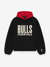 The Essentials Bulls hoodie is crafted from core fleece and features a voluminous, cropped silhouette. The front displays a rubberized soft-touch Bulls Essentials lockup along with the iconic NBA logo on the sleeve. Additional details include a contrasting double layered hood, side seam pockets, and elastic bindings at the cuffs and waist hem. A rubberized Fear of God label is attached to the hood. DETAILS - 80% cotton / 20% polyester heavyweight fleece - Essentials modern fit - cropped, voluminous body, sleeves - Rubberized soft-touch Bulls ESSENTIALS graphic and NBA logo - Fear of God rubberized label on the hood - Side seam pockets - Contrasting double layered hood - Elastic Binding at cuff and tapered waistband - Imported