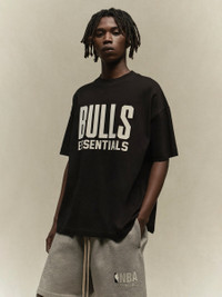 The Essentials Bulls short sleeve tee is crafted from core cotton jersey. It features a relaxed fit in the body with dropped shoulders and a rib-knit crewneck. On the front, there is a rubberized soft-touch "BULLS ESSENTIALS" lockup, along with the iconic NBA logo on the back. Additionally, a rubberized "Essentials Fear of God" label is located at the back collar. DETAILS - 100% cotton jersey, 220gsm - Essentials classic fit - relaxed body and sleeves - Rubberized soft-touch BULLS ESSENTIALS graphic and NBA logo - Classic rib-knit collar - Essentials Fear of God rubberized label at back collar - Imported