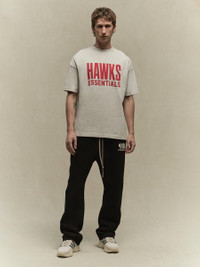 The Essentials Hawks short sleeve tee is crafted from core cotton jersey. It features a relaxed fit in the body with dropped shoulders and a rib-knit crewneck. On the front, there is a rubberized soft-touch Hawks Essentials lockup along with the iconic NBA logo on the back. Additionally, a rubberized Fear of God label is located at the back collar. DETAILS - 100% cotton jersey, 220gsm - Essentials classic fit - relaxed body and sleeves - Rubberized soft-touch Hawks ESSENTIALS graphic and NBA logo - Classic rib-knit collar - Fear of God rubberized label at back collar - Imported