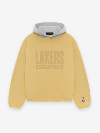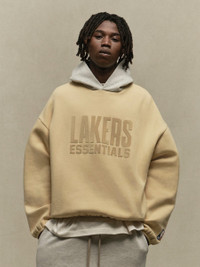 The Essentials Lakers hoodie is crafted from core fleece and features a voluminous, cropped silhouette. The front displays a rubberized soft-touch Lakers Essentials lockup along with the iconic NBA logo on the sleeve. Additional details include a contrasting double layered hood, side seam pockets, and elastic bindings at the cuffs and waist hem. A rubberized Fear of God label is attached to the hood. DETAILS - 80% cotton / 20% polyester heavyweight fleece - Essentials modern fit - cropped, voluminous body, sleeves - Rubberized soft-touch Lakers ESSENTIALS graphic and NBA logo - Fear of God rubberized label on the hood - Side seam pockets - Contrasting double layered hood - Elastic Binding at cuff and tapered waistband - Imported