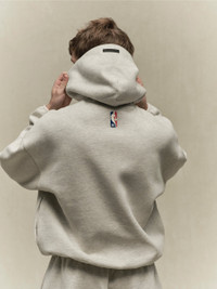 The Essentials NBA hoodie is made from core fleece and showcases a trendy cropped silhouette. The front features a rubberized soft-touch "NBA ESSENTIALS" logo, along with the iconic NBA logo. Additional details include a contrasting double-layered hood, side seam pockets, and elastic bindings at the cuffs and hem. A rubberized "Essentials Fear of God" label is attached to the hood, while a NBA logo is located on the back collar, underneath the hood. DETAILS - 80% cotton / 20% polyester heavyweight fleece - Essentials modern fit - cropped ,voluminous body, sleeves - Rubberized soft-touch NBA ESSENTIALS graphic and NBA logo - Essentials Fear of God rubberized label on the hood - Side seam pockets - Double layered hood - Elastic Binding at cuff and tapered waistband - Imported