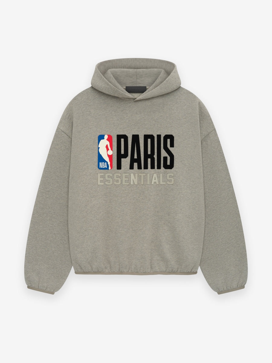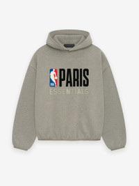 The Paris Essentials hoodie is crafted from core fleece and features a voluminous, cropped silhouette. The front displays a rubberized soft touch Paris Essentials lockup along with the iconic NBA logo. Additional details include a double layered hood, side seam pockets, and elastic bindings at the cuffs and waist hem. A rubberized Fear of God label is attached to the hood. DETAILS - 80% cotton / 20% polyester heavyweight fleece - Essentials modern fit - cropped ,voluminous body, sleeves - Rubberized soft-touch PARIS ESSENTIALS graphic and NBA logo - Fear of God rubberized label on the hood - Side seam pockets - Double layered hood - Elastic Binding at cuff and tapered waistband - Imported