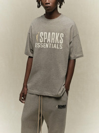 The Essentials Sparks short sleeve tee is crafted from core cotton jersey. It features a relaxed fit in the body with dropped shoulders and a rib-knit crewneck. On the front, there is a rubberized soft-touch "SPARKS ESSENTIALS" lockup, along with the WNBA logo. Additionally, a rubberized "Essentials Fear of God" label is located at the back collar. DETAILS - 80% cotton / 20% polyester heavyweight fleece - Essentials modern fit - cropped, voluminous body, sleeves - Rubberized soft-touch SPARKS ESSENTIALS graphic and WNBA logo - Essentials Fear of God rubberized label on the hood - Side seam pockets - Contrasting double layered hood - Elastic Binding at cuff and tapered waistband - Imported